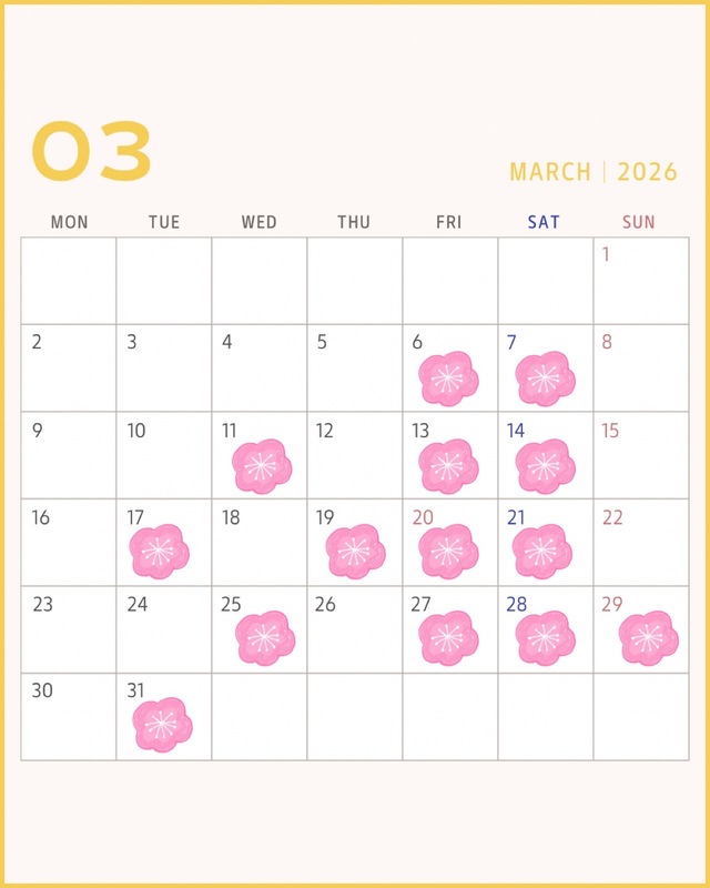| 3/31(火) | 4/1(水) | 4/2(木) | 4/3(金) | 4/4(土) | 4/5(日) | 4/6(月) | 4/7(火) | 4/8(水) | 4/9(木) | 4/10(金) | 4/11(土) | 4/12(日) | 4/13(月) |